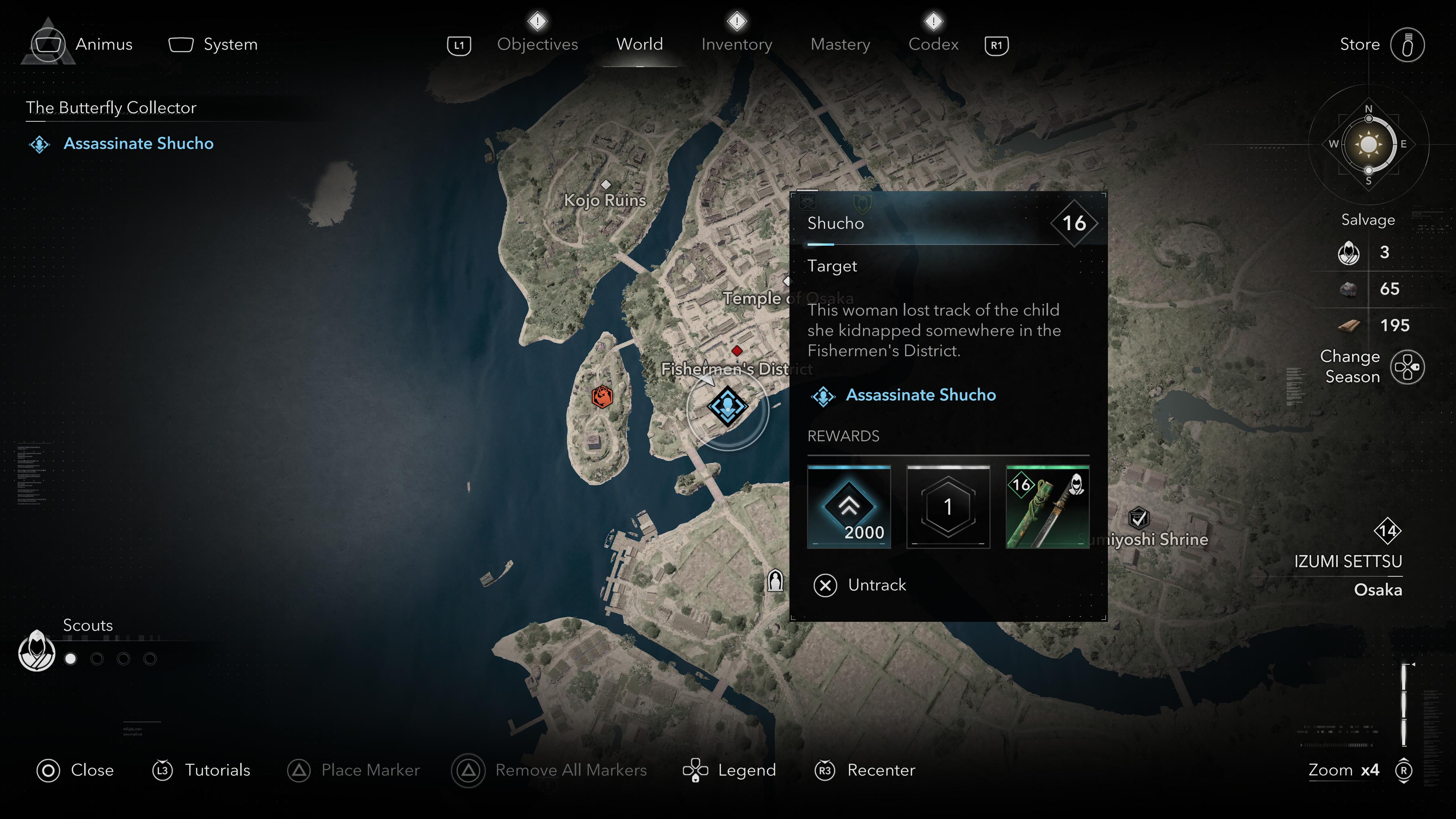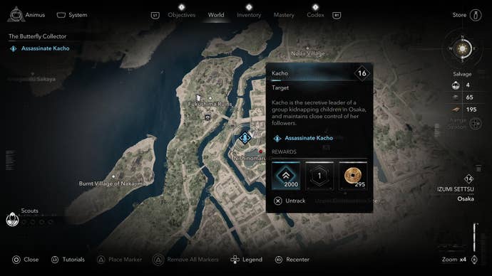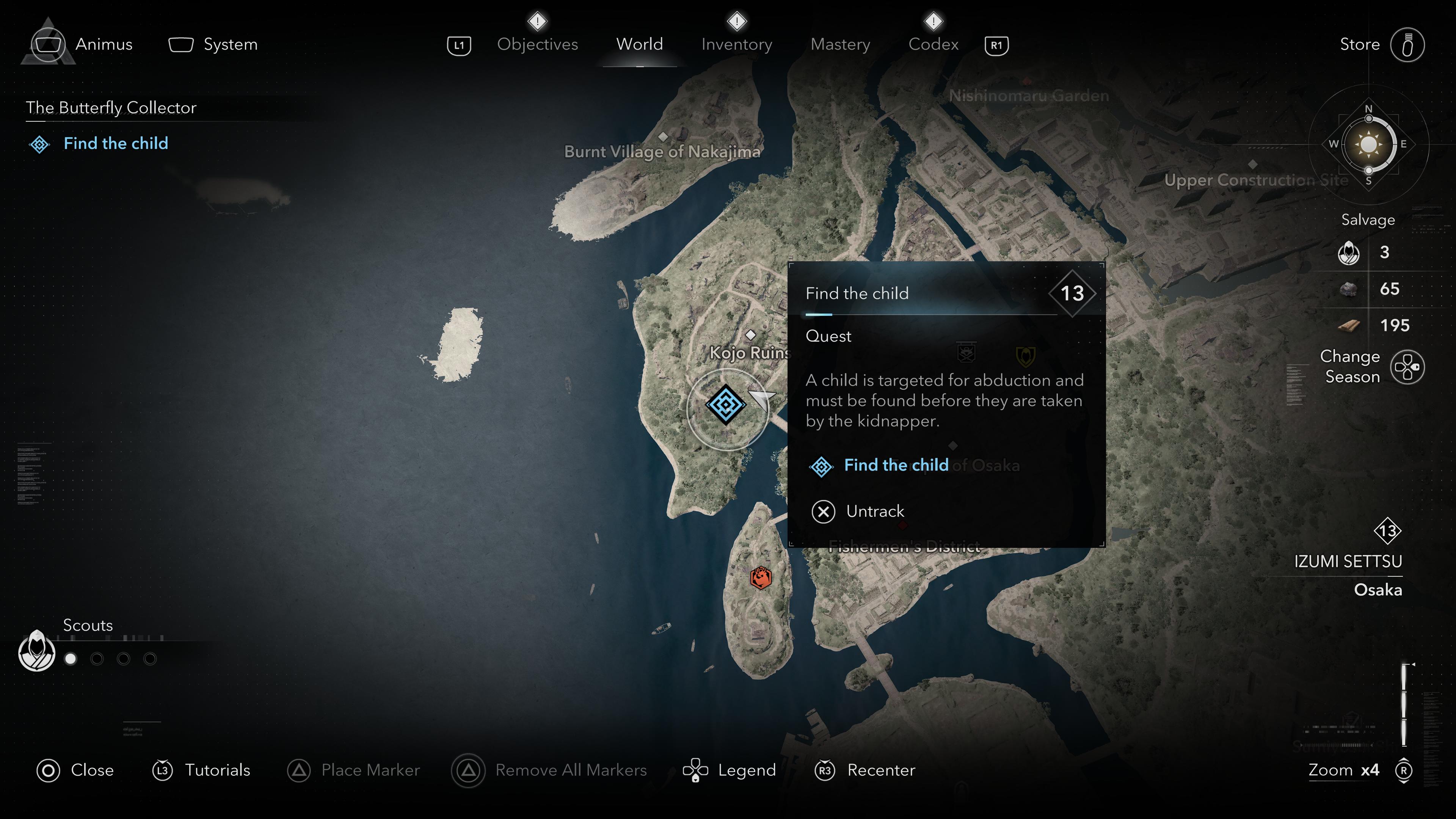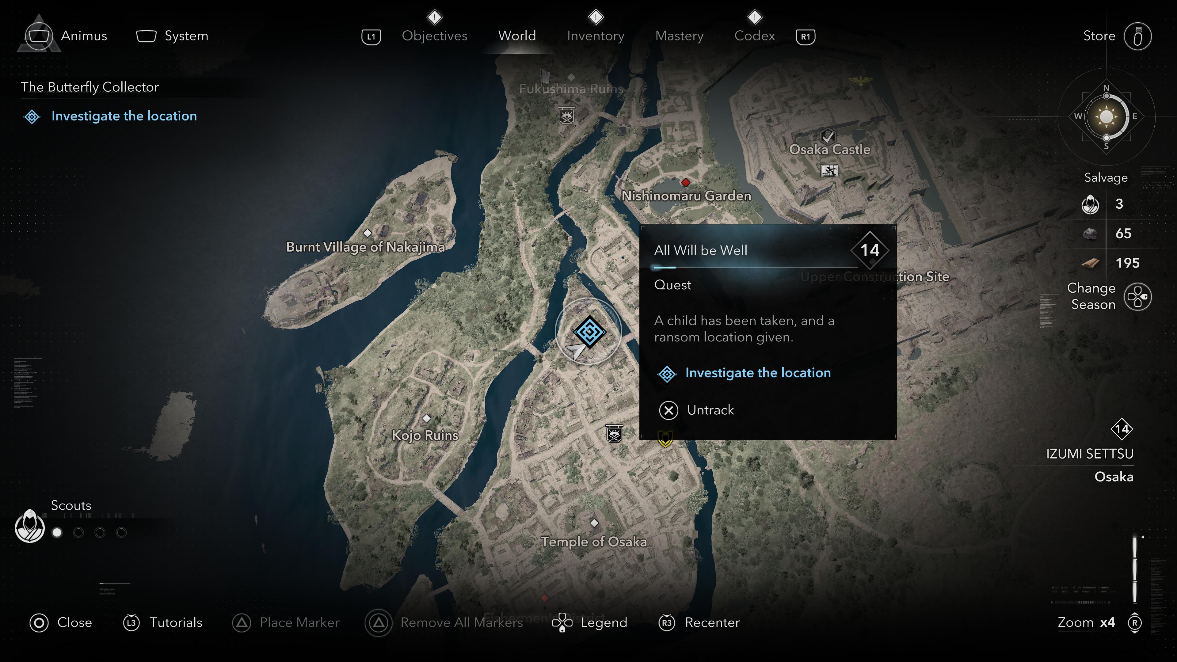 Когда вы найдёте вторую белую бабочку рядом с сгоревшими зданиями к северо-западу от храма Осаки, рядом с руинами Кодзё, это приведёт вас к ребёнку торговца сакэ, которого можно найти на острове к западу от Осаки.