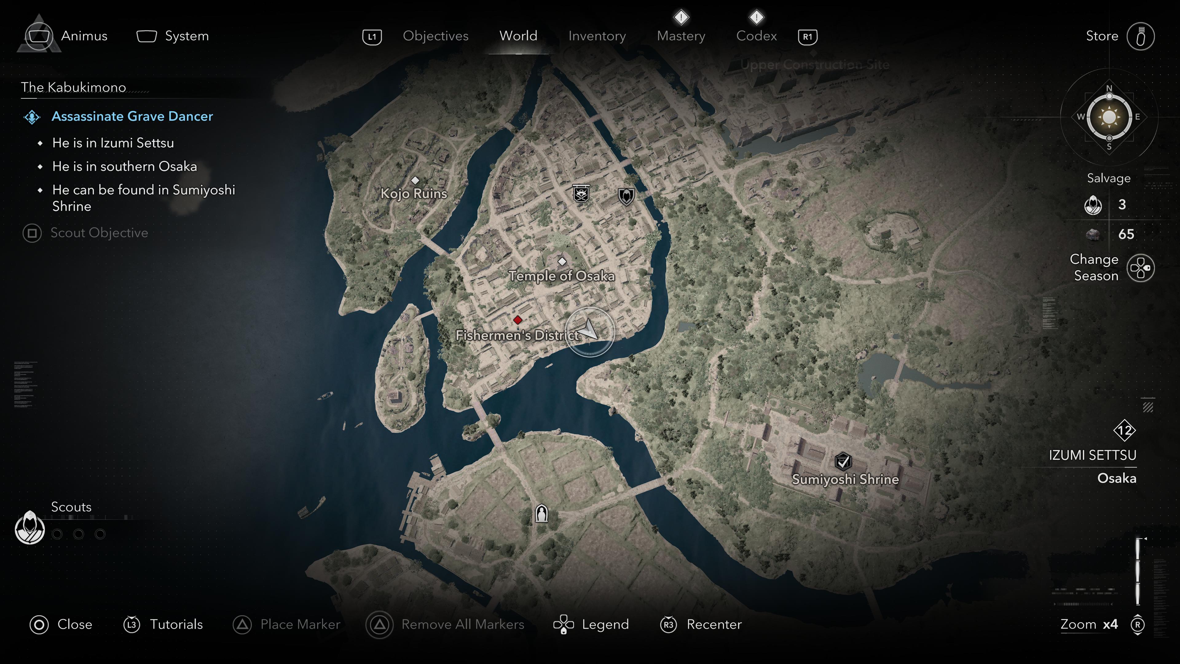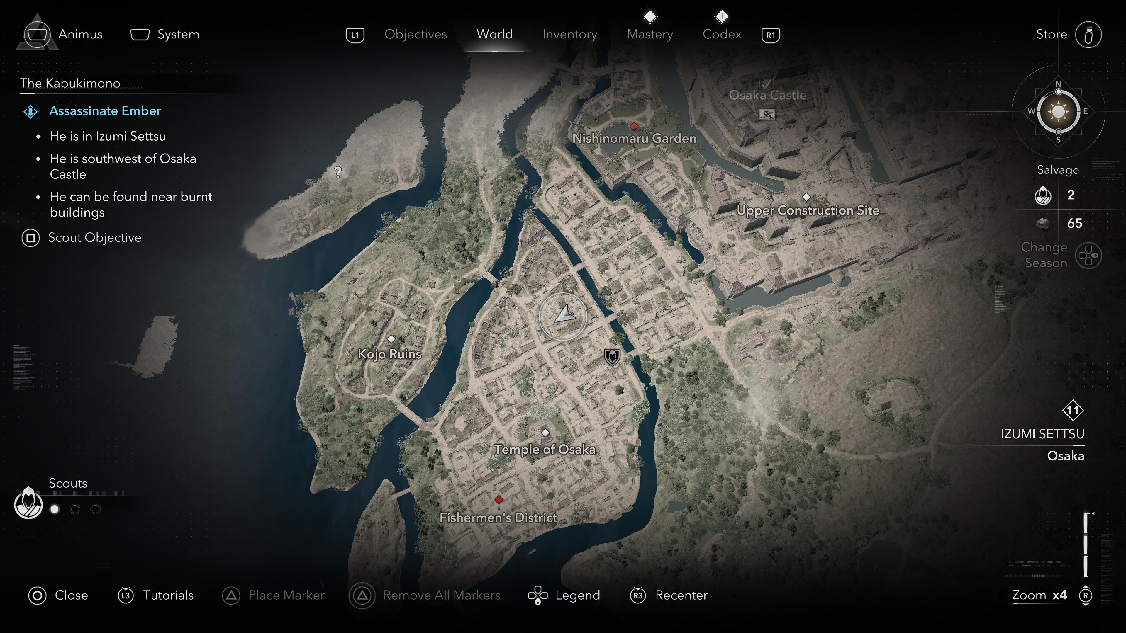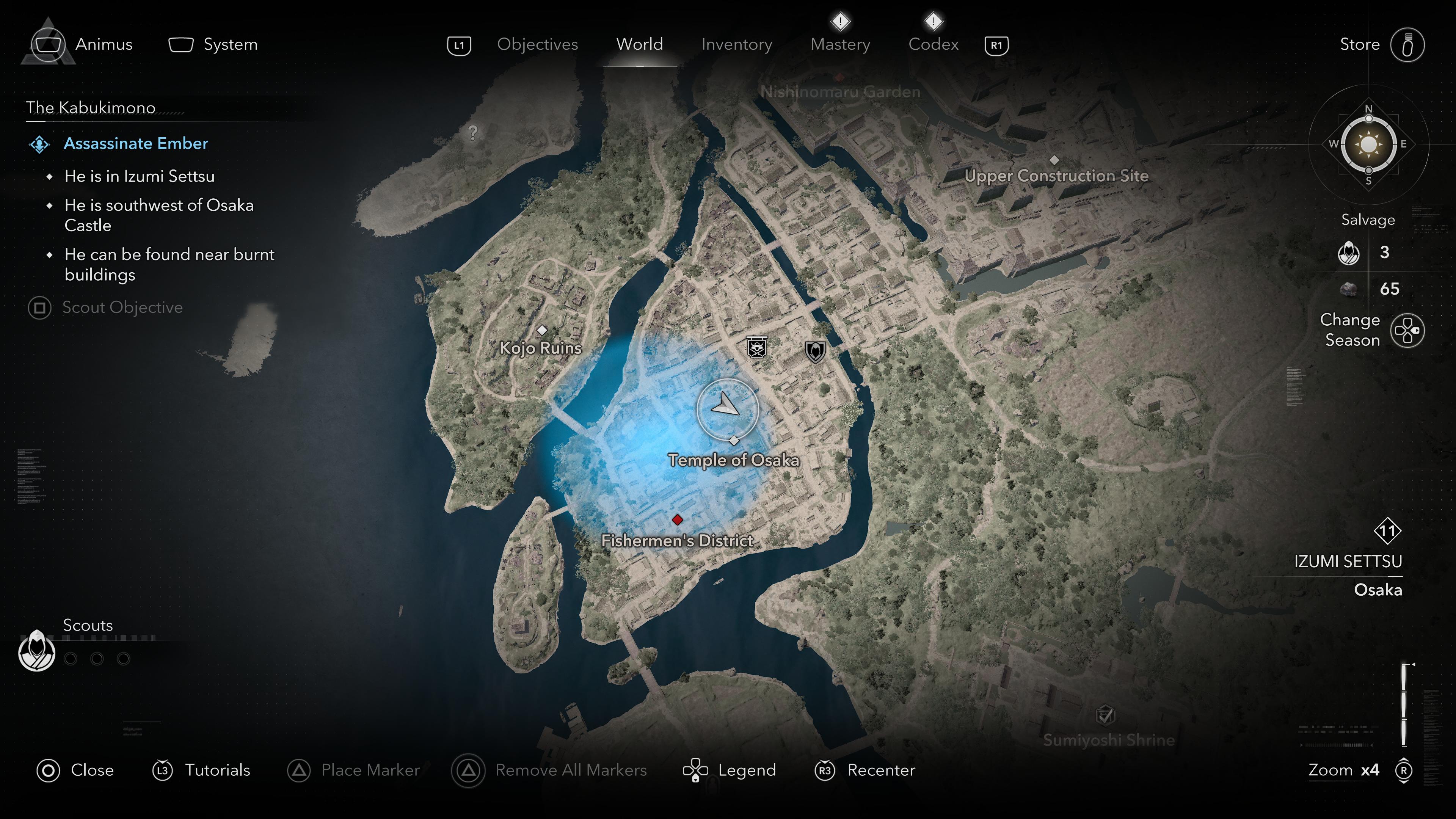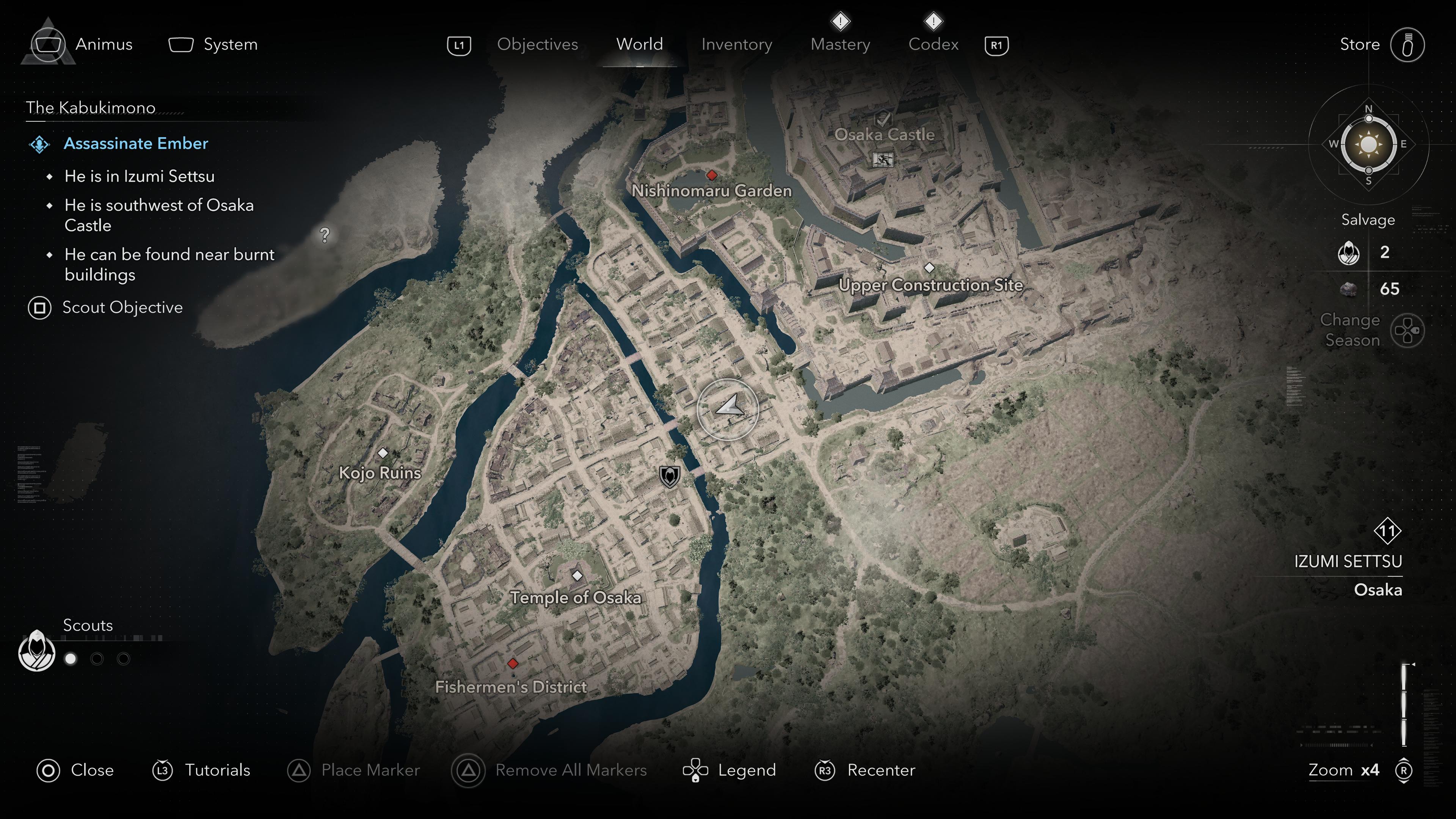 Когда вы найдёте вторую белую бабочку рядом с сгоревшими зданиями к северо-западу от храма Осаки, рядом с руинами Кодзё, это приведёт вас к ребёнку торговца сакэ, которого можно найти на острове к западу от Осаки.