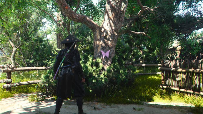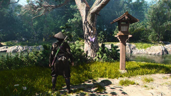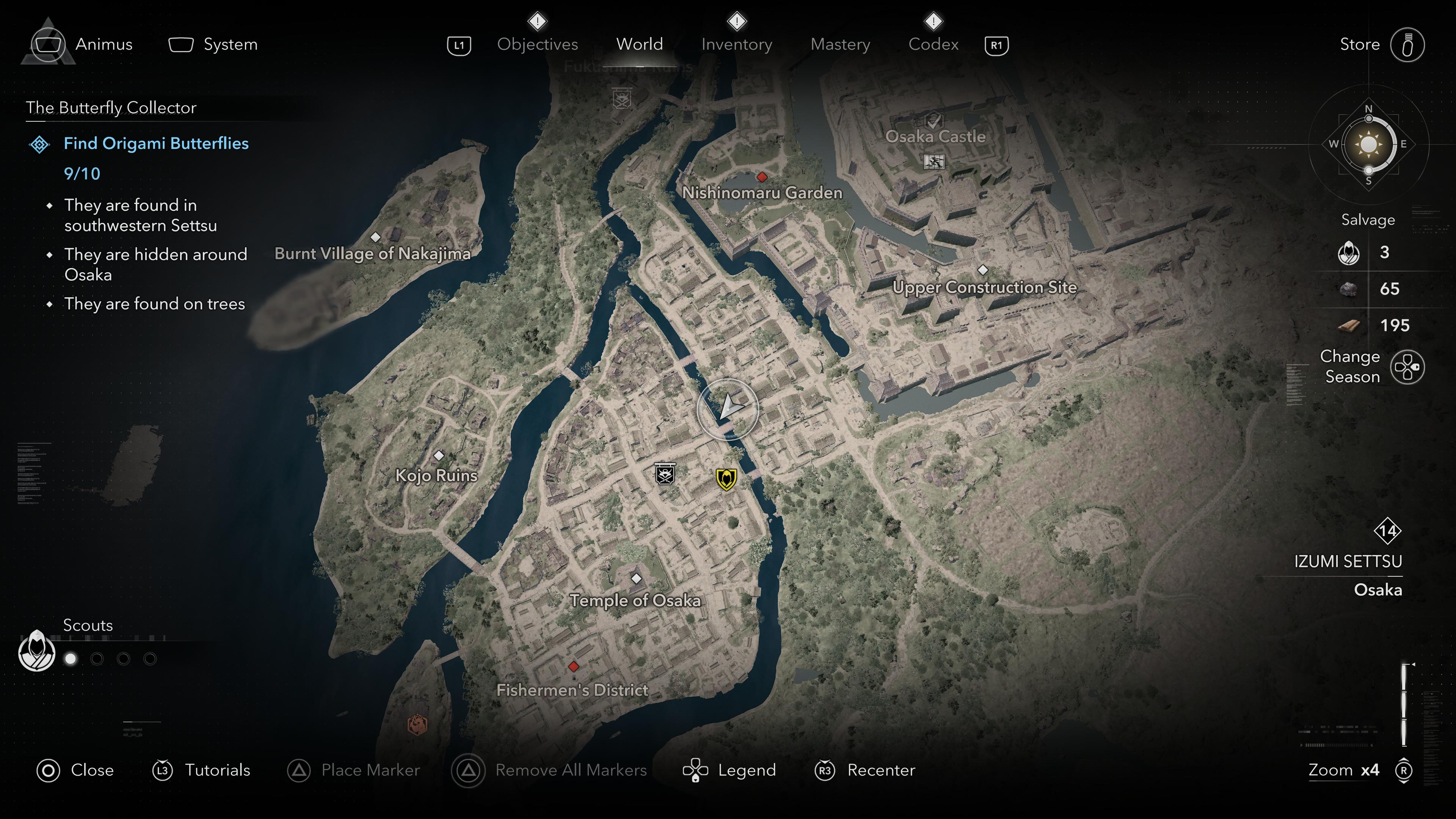 Чтобы найти оранжевую бабочку, идите на юг от храма Осаки и соберите её с дерева у реки:
