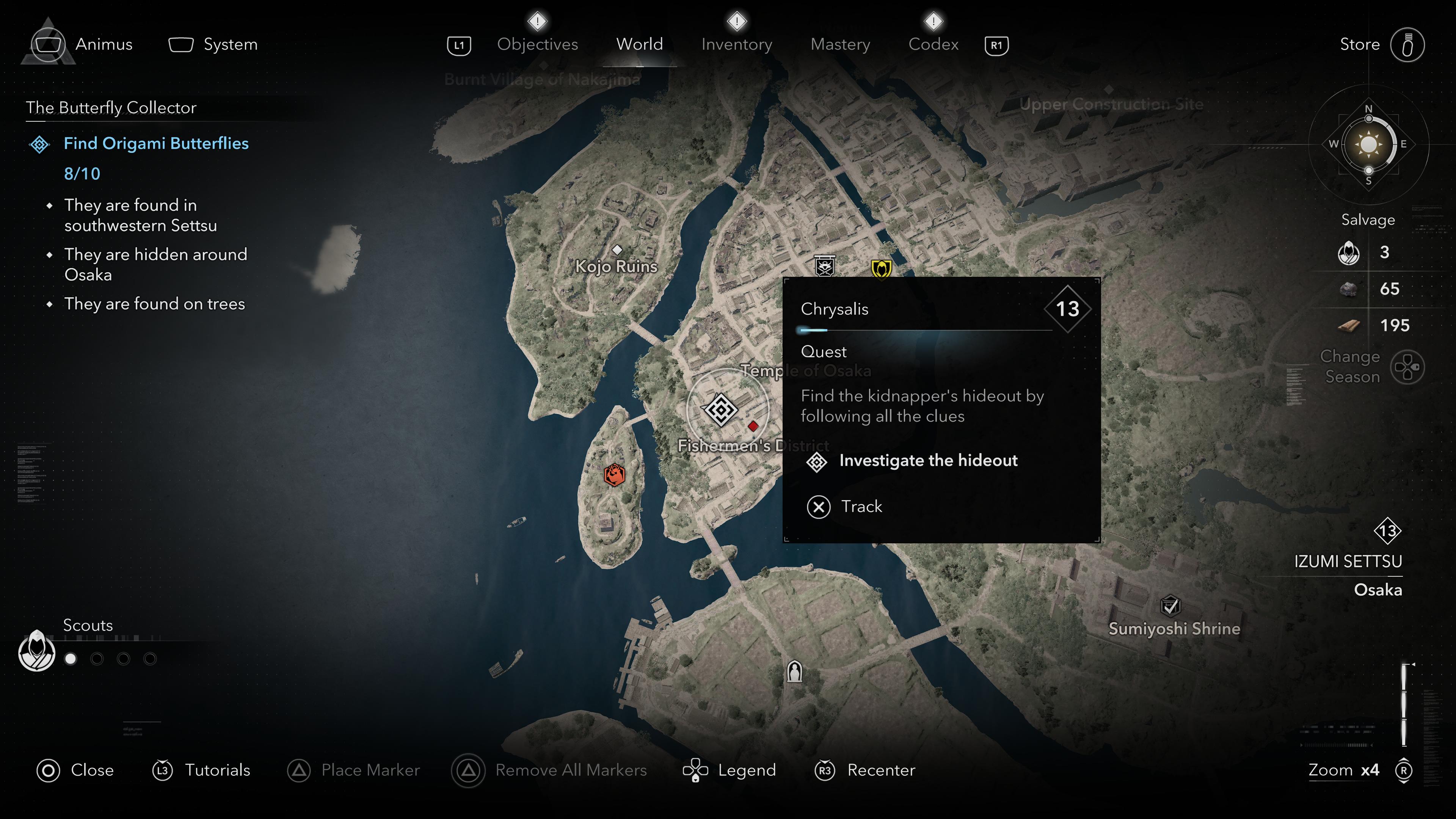 Выполнив этот этап задания, вы получите наводку на организатора похищений. Поговорите с торговцем бумагой в городе, прямо на северо-восточном углу храма Осаки, и он скажет вам, что бумагу, из которой делают бабочек, доставляют в сад Нисиномару — это важная подсказка.