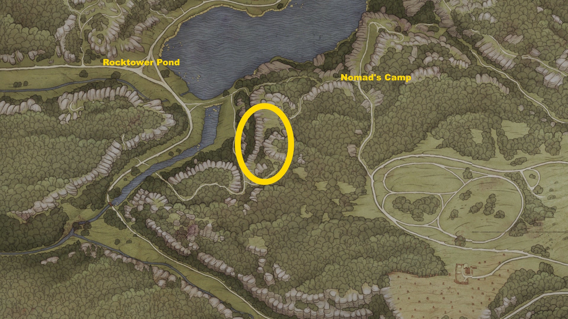 Отправляйтесь в точку, отмеченную на карте выше, и вы увидите след из мёртвых животных. Этот след приведёт вас к пещере, где Мотт с удовольствием роется в земле. Из пещеры выходит волчья стая, и то, что происходит дальше, — это, по сути, обучающее пособие по использованию Мотта в бою. Прикажите ему атаковать волков вместе с вами, чтобы облегчить эту битву.